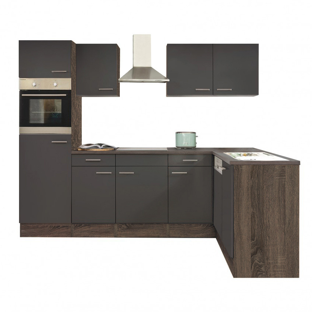 Yorki sarok konyhablokk yorki tölgy korpusszal, selyemfényű antracit fronttal, 280 cm-es méretben. A mosogatótálcát és gépeket az ár nem tartalmazza.