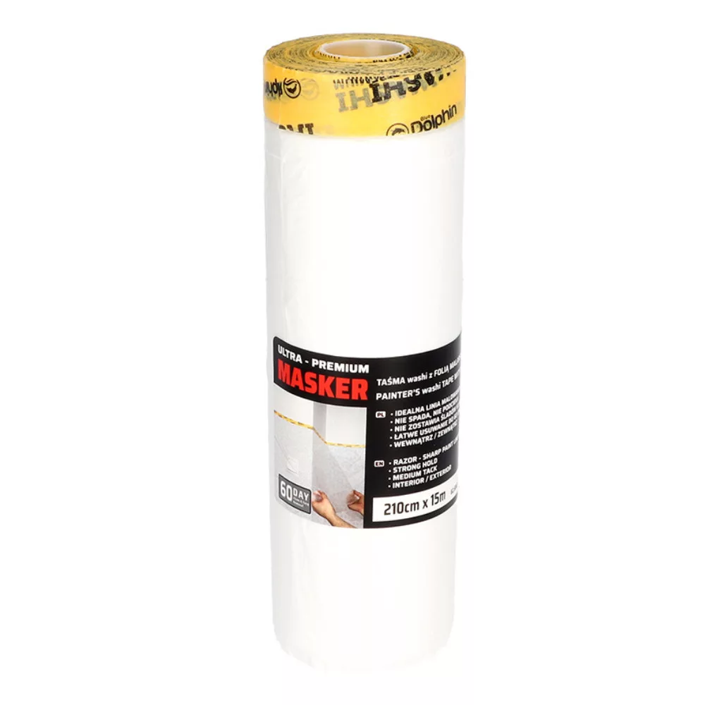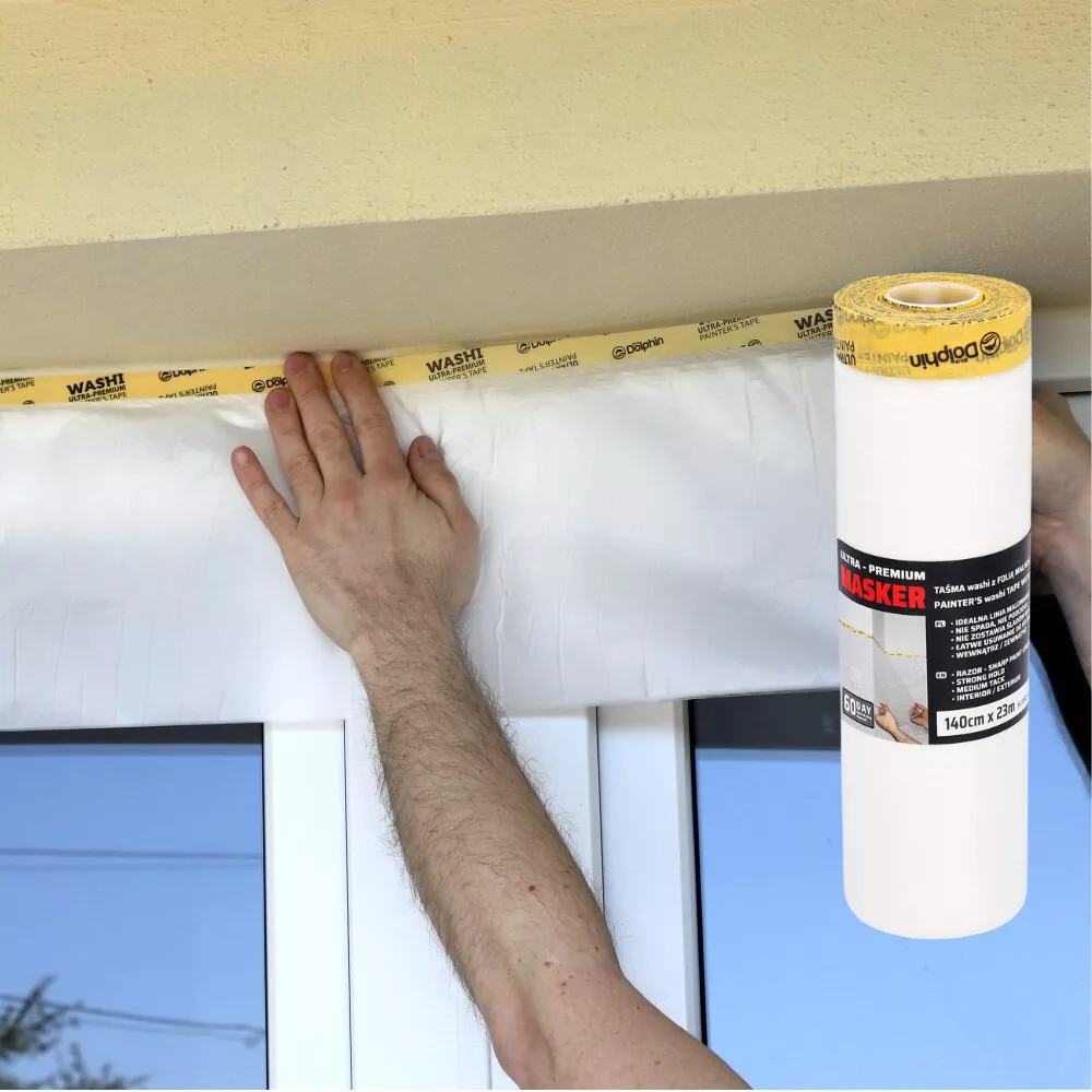 A Blue Dolphin Masker Washi 280 cm szélességű változata kifejezetten nagy felületek – például teljes falak, nyílászárók, konyhabútorok, csempézett felületek vagy üvegportálok – gyors és hatékony letakarására készült. Az elektrosztatikus PE fólia a felülethez tapad, így munka közben nem mozdul el, miközben a washi festőszalag pontos, aláfolyásmentes festési vonalat biztosít.