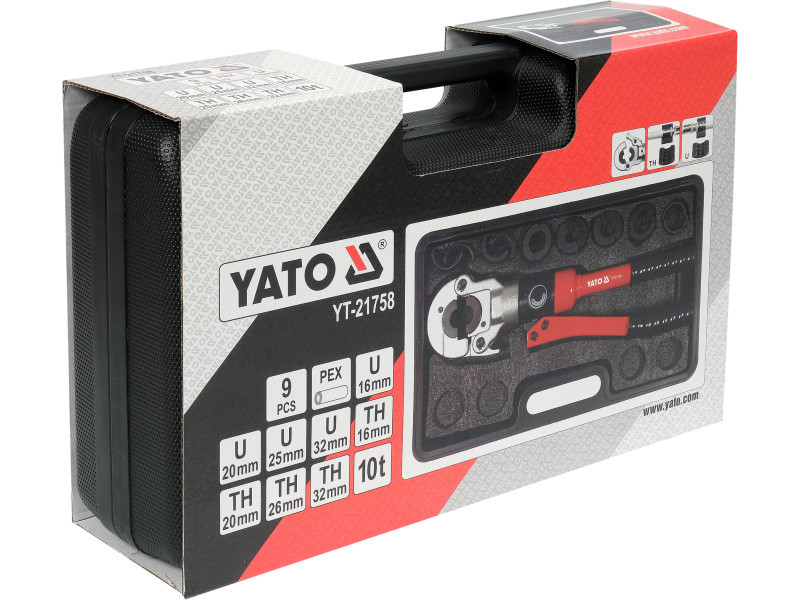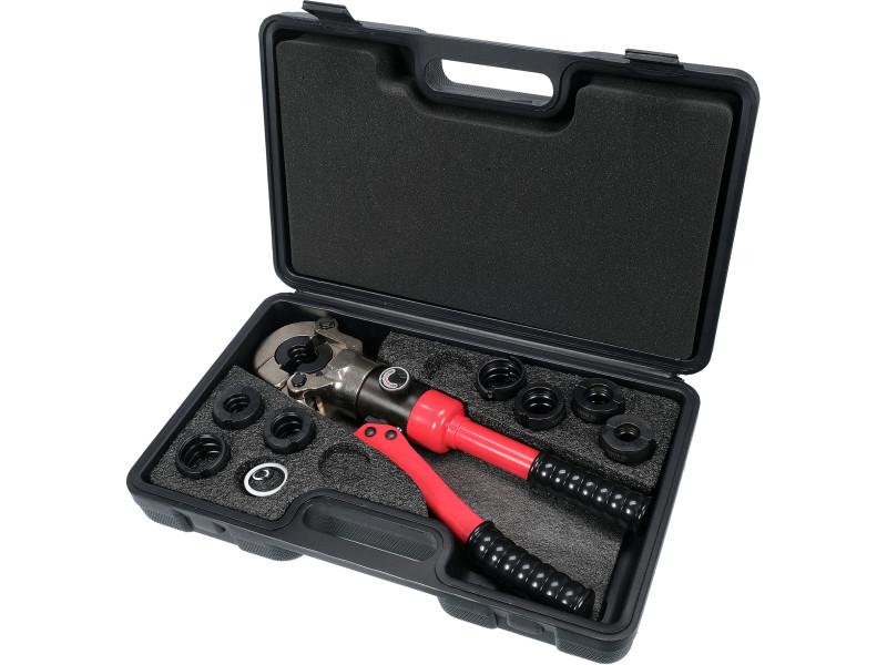 Hidraulikus kézi prés PEX-AL-PEX, PERT-AL-PERT csövek szerelvényeinek krimpeléséhez 8 darabos szerszámkészlettel. Hidraulikus hengerrel van felszerelve, amely lehetővé teszi a szerelvények pontos és szoros krimpelését 10T nyomóerővel. A gyors szerszámcsere-rendszer lehetővé teszi a szerszámok egyszerű cseréjét.