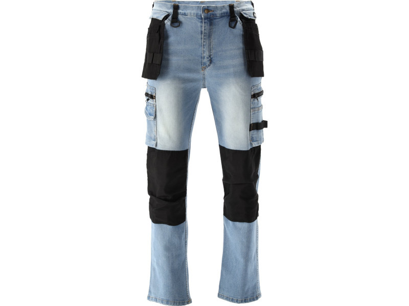 A rugalmas anyagból készült munkás nadrágok, kopott és rugalmas farmerből. Összesen tizenhét zseb, köztük egy tépőzáras, két cipzáras és két levehető munkás zseb. A sok alapzseb és a strapabíró anyagból készült munkás zsebek segítenek a asztalosok, tetőfedők vagy vízvezeték-szerelők munkájának megszervezésében.